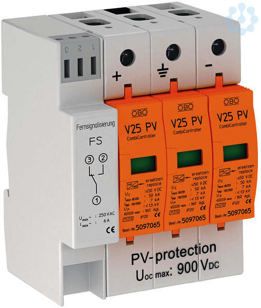 Kombiableiter Typ 1+2 für Photovoltaik-Anlagen. Fehlerresistente Y-Schaltung zum Einsatz nach VDE 0100-712 (IEC 60364-7-712). Überspannungsschutz-Potentialausgleich nach VDE 0100-443 (IEC 60364-4-44). Ableitvermögen bis 7 kA (10/350) und 50 kA (8/20) pro Pol. Niedriger DC-Schutzpegel: < 3,0 KV und Uoc max = 900V DC. Ableiter steckbar mit thermo-dynamischer Abtrennvorrichtung und optischer Funktionsanzeige. Gekapselte Zinkoxid-Varistor-Ableiter zum Einsatz in Verteilergehäusen. Anwendung: PV-Anlagen mit Blitzschutzanlage.