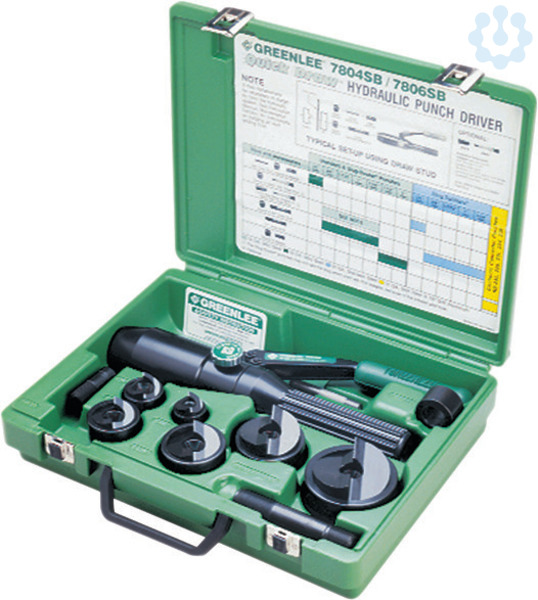 Bestehend aus Hand-Hydraulik Stanze 7804E (50342886), Zugbolzen für hydraulische Betätigung Durchmesser 9,5 x 71 mm (51300430), Zugbolzen für hydraulische Betätigung Durchmesser 19,0 x 105 mm (50318721), Distanzbuchse, kurz (50032488), Adapter Durchmesser 19,0 x 48 mm mit Innengewinde 9,5 mm (50339672), Slug Buster Spalt-Blechlocher-Satz ISO 16/20/25/32/40 (50356178SET), Kunststoffkoffer (50352024).