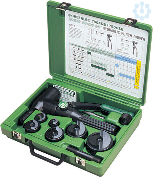 Bestehend aus Hand-Hydraulik Stanze 7904E (50337866), Zugbolzen für hydraulische Betätigung Durchmesser 9,5 x 71 mm (51300430), Zugbolzen für hydraulische Betätigung Durchmesser 19,0 x 105 mm (50318721), Distanzbuchse, kurz (50032488), Adapter Durchmesser 19,0 x 48 mm mit Innengewinde 9,5 mm (50339672), Slug Buster Spalt-Blechlocher-Satz ISO 16/20/25/32/40 (50356178SET), Kunststoffkoffer (50352024).