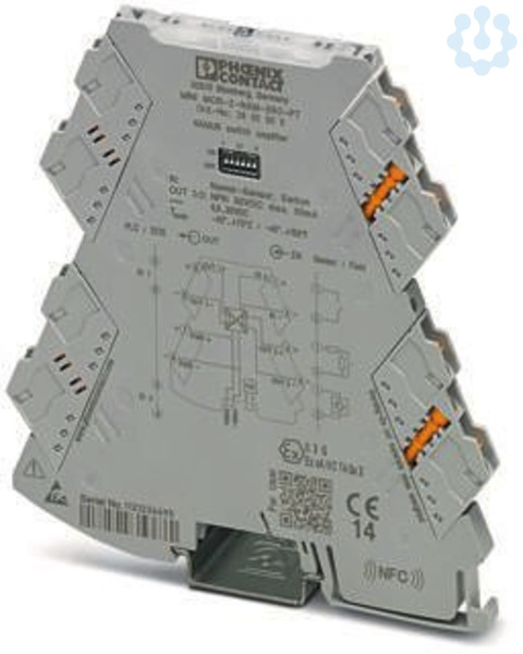 Konfigurierbarer NAMUR-Trennschaltverstärker mit steckbarer Anschlusstechnik für Näherungsinitiatoren, potenzialfreien und widerstandsbeschalteten Schaltkontakten. 2 Transistorausgänge. Konfigurierbar über DIP-Schalter. Push-in- Anschlusstechnik.