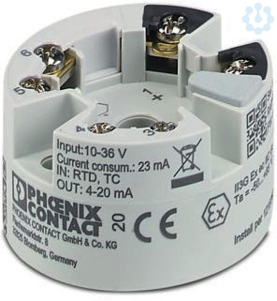 Ausgangsschleifengespeister Kopftransmitter zur Übertragung von RTD- und TC-Sensorsignalen sowie von Widerstands- und Spannungsgebern über die HART(R)-Kommunikation oder 4 mA ... 20 mA, frei konfigurierbar, Schraubanschluss.