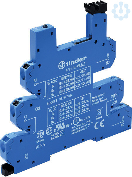 MasterPLUS Relaisfassung mit Push-In-Klemmen, Farbe blau, für Relais 34.51 oder 34.81, mit Halte- und Demontagehebel, integrierte LED-Anzeige und EMV-Entstörbeschaltung des Eingangs. ((sichere Trennung)) nach VDE 0106, Teil 101, Betriebsnennspannung 24-240 V AC/DC. Steckvorrichtung für Sicherungsmodul 093.63.