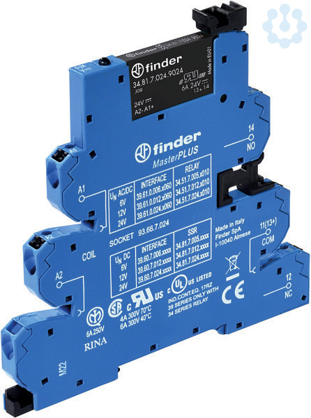 MasterPLUS schmales Koppelrelais für DIN-Schiene, mit Push-In-Klemmen, modular aufgebaut, SSR-Kontakte 1 Schließer 6 A 24 V DC, universell als Koppelrelais im Eingang zur SPS oder im Ausgang der SPS einsetzbar zur Ansteuerung von Aktoren, LED-Anzeige, Klemmen A1 oder A2 und 13+ sind brückbar, Ausgangssicherungsmodul Typ 093.63 für 5 x 20 mm Feinsicherungen anstelle des Blindstopfens einsetzbar, Spulenspannung 24 V DC