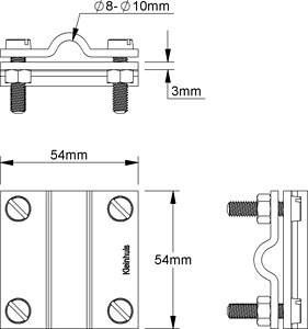Kreuz-Verbinder nach DIN EN 62561 (VDE 0185-561) ohne Klemmplatte mit Zylinderkopfschrauben nach DIN EN ISO 1207 und Sechskantmuttern nach DIN ISO 4032, für oberirdische Verbindungen und Blitzschutz. Abmessungen (ca. Maße) Klemmplatten B x L x t : 54 x 54 x 3 mm Verbindungsmöglichkeiten