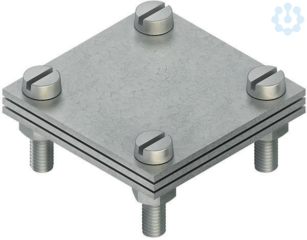 Kreuz-Verbinder nach DIN EN 62561 (VDE 0185-561) inkl. Klemmplatte mit Zylinderkopfschrauben nach DIN EN ISO 1207 und Sechskantmuttern nach DIN ISO 4032, für oberirdische Verbindungen und Blitzschutz. Abmessungen (ca. Maße) Klemmplatten B x L x t