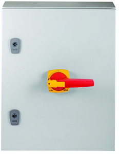 Lasttrennschalter, DMV, 400 A, 4-polig, NOT-AUS-Funktion, mit rotem Drehgriff und gelbem Sperrkranz, im Stahlgehäuse, Anschlussbohrung 11 mm