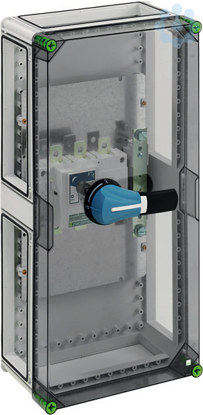 Lasttrennschaltergehäuse, Industrie Qualität mit externer Betätigung, abschließbar, 1 x Lasttrennschalter 250A, 3-polig schaltend, Schraubanschluss M10, PE/N-Klemme M10, 4 x Gehäuseverbinder (GGV), mit transparentem Deckel