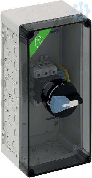 Lasttrennschaltergehäuse, Industrie Qualität mit externer Betätigung, abschließbar, IP65 (bei Verwendung entsprechender Kabeleinführungen), 1 x Lasttrennschalter 63A, 3-polig schaltend, Käfigklemme 2,5-35qmm, PE/N-Klemme 16qmm, mit IP54 Anbaustutzen, mit Isolierstopfen, mit transparentem Deckel