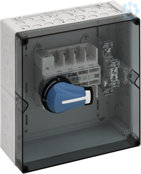 Lasttrennschaltergehäuse, Industrie Qualität mit externer Betätigung, abschließbar, IP65 (bei Verwendung entsprechender Kabeleinführungen), 1 x Lasttrennschalter 160A, 3-polig schaltend, Käfigklemme 10-70qmm, PE/N Klemme 2 x 50qmm, mit IP54 Anbaustutzen, mit Isolierstopfen, mit transparentem Deckel