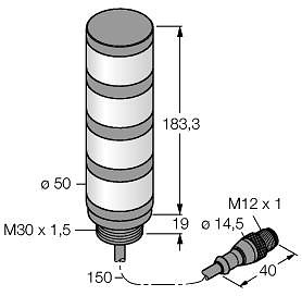 LED-Anzeige, Signalsäule, Schwarzes Kunststoffgehäuse, Schutz gegen elektromagnetische und hochfrequente Störungen, Schutzart IP67, Kabel mit Stecker M12X1, 150 mm, Betriebsspannung: 18?30 VDC oder 24 VAC bei jeweils 45mA pro LED-Farbe, Eingänge: PNP / NPN, Leitungslänge 0.15 m, Farben: Blau (COL 1) / Grün (COL 2) / Gelb (COL 3) / Rot (COL 4)