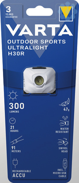 Ultra leichte, wiederaufladbare Kopfleuchte mit bis zu 300 lm, schwenkbarem Kopf und verstellbarem Kopfband für ultimativen Tragekomfort. Verfügt über eine Dimmfunktion und eine Lade- und Batteriestandanzeige (rot, gelb, grün). Ist IPX4 spritzwassergeschützt und stoßfest. Ein abnehmbarer Befestigungsclip, um die Leuchte als Clip-Leuchte zu verwenden, ist inklusive. Tastensperre - verhindert ein unbeabsichtigtes anschalten. Inklusive einem 1m Micro USB Kabel. Die Batterie ist UL zertifiziert. In der Farbe weiß und mit einer wiederaufladbaren Li-Polymer Batterie.
