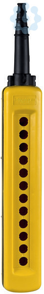 XAC A Leergehäuse. 12 Bohrungen in 1 Spalte. Befehlsstellen 12. Lieferumfang Gehäuse, Innenplatine, Kabelknickschutzhülle. Kabelzugentlastung, Spannband für Knickschutzhülle, Ringöse.