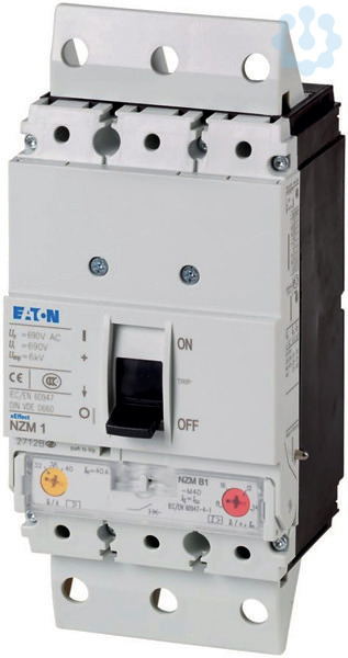 Leistungsschalter NZM1, 3-polig, Schaltvermögen 400/415 V 50 Hz( Icu ): 25 kA, Bemessungsstrom = Bemessungsdauerstrom Bemessungsstrom = Bemessungsdauerstrom( In = Iu ): 100 A, Einbautechnik: Stecktechnik, Rahmenklemme, Norm/Zulassung: IEC, Schutzfunktion: Anlagen- und Kabelschutz
