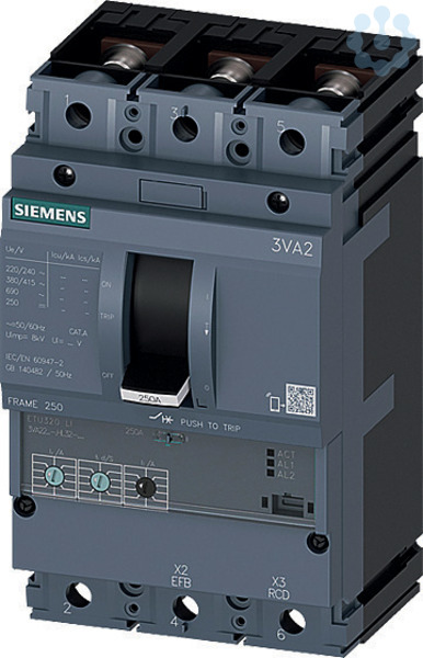 Leistungsschalter 3VA2 IEC Frame 250 Schaltvermögenklasse C Icu=110kA @ 415V 3-polig, Anlagenschutz ETU320, LI, In=250A Überlastschutz Ir=100A...250A Kurzschlussschutz Ii=1,5...10 x In Schraubenflachanschluss Unterspannungsauslöser (UVR) 120-127V AC 50/60Hz 2 Hilfsschalter HQ Kompaktleistungsschalter 3VA2 mit ETU 3-er Reihe für Anlagenschutz. Die Kompaktleistungsschalter 3VA von Siemens als wichtiger Bestandteil der SENTRON Schutzkomponenten für industrielle Anwendungen sowie für Anwendungen im Infrastrukturbereich bieten effektiven Anlagen -, Starter- und Motorschutz durch sicheres Abschalten im Überlast- und Kurzschlussfall. Die Kompaktleistungsschalter 3VA setzen dabei Maßstäbe in Flexibilität und modularer Zubehörvielfalt. Einheitliches Zubehör für mehrere Baugrößen über alle Baureihen des Kompaktleistungsschalters 3VA1 und 3VA2. Diese Variante des Kompaktleistungsschalters 3VA zeichnet sich vor allem aus durch: 1. Kompakte Bauform. 2. Verfügbar als Variante für den Anlagenschutz und Generatorschutz abhän