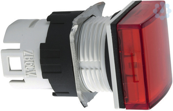 Quadratischer roter Leuchtmelder-Frontelement für integrierte LED. Es ist Teil der Baureihe Harmony XB6 mit einem Durchmesser von 16 mm, kompakte Kunststoffdrucktaster, Schalter und Leuchtmelder.