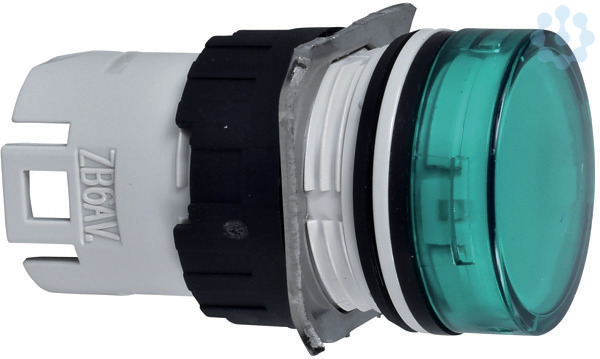 Grüner Leuchtmelder-Frontelement für integrierte LED. Es ist Teil der Baureihe Harmony XB6 mit einem Durchmesser von 16 mm, kompakte Kunststoffdrucktaster, Schalter und Leuchtmelder.
