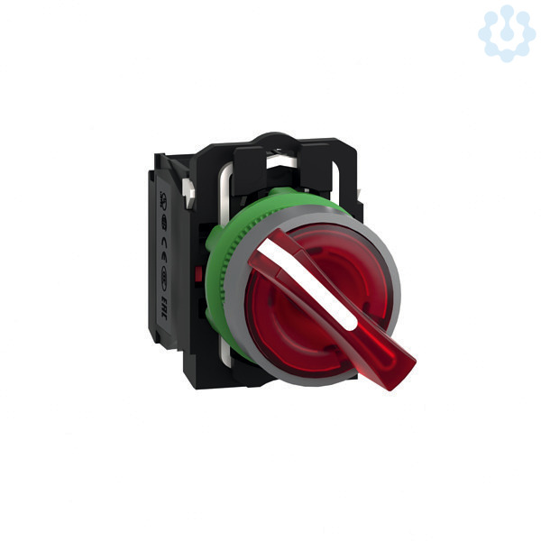 Leuchtwahlschalter aus Kunststoff als Komplettgerät und 22mm Einbaumaß, Baureihe Harmony XB5. Farbe des Leuchtwahlschalters ist rot und der Betätiger hat 2 Stellungen mit 1 Öffner und 1 Schließer. Für 120V AC. Die Farbe des Außenrings ist grau. Die modularen Harmony Baureihen mit 22mm Einbaumaß kombinieren einfache Installation, Effizienz, modernes Design, Flexibilität mit höchster Robustheit. IP-Schutzklassen bis IP69K und Umgebungstemperaturen von -40°C bis +70°C. Produktstandards gem. EN/IEC 60947-5-1, EN/IEC 60947-5-4, CSA C22.2 No 14, UL 508, EN/IEC 60947-1, JIS C 4520. Zertifizierungen nach DNV, GL, UL gelistet, RINA, BV, CSA, LROS (Lloyds register of shipping). Produktstandards gem. EN/IEC 60947-5-1, EN/IEC 60947-5-4, CSA C22.2 No 14, UL 508, EN/IEC 60947-1, JIS C 4520.