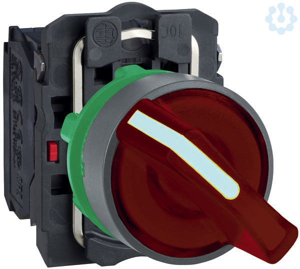 Leuchtwahlschalter aus Kunststoff als Komplettgerät und 22mm Einbaumaß, Baureihe Harmony XB5. Farbe des Leuchtwahlschalters ist rot und der Betätiger hat 2 Stellungen mit 1 Öffner und 1 Schließer. Für 230V AC. Die Farbe des Außenrings ist grau. Die modularen Harmony Baureihen mit 22mm Einbaumaß kombinieren einfache Installation, Effizienz, modernes Design, Flexibilität mit höchster Robustheit. IP-Schutzklassen bis IP69K und Umgebungstemperaturen von -40°C bis +70°C. Produktstandards gem. EN/IEC 60947-5-1, EN/IEC 60947-5-4, CSA C22.2 No 14, UL 508, EN/IEC 60947-1, JIS C 4520. Zertifizierungen nach DNV, GL, UL gelistet, RINA, BV, CSA, LROS (Lloyds register of shipping). Produktstandards gem. EN/IEC 60947-5-1, EN/IEC 60947-5-4, CSA C22.2 No 14, UL 508, EN/IEC 60947-1, JIS C 4520.