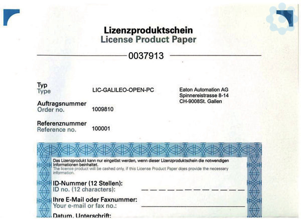 Lizenzproduktschein für den dauerhaften und uneingeschränkten Betrieb des Galileo Runtime-Systems auf einem PC