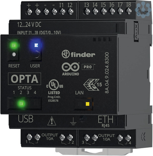 OPTA LITE. Eine Reihe von einfachen und eigenständigen PROGRAMMIERBAREN LOGIKRELAIS ideal für einfache Anwendungen in der industriellen Automatisierung, OEM und Gebäudeautomation IoT. Programmierbar mit herkömmlichen Programmiersprachen (Ladder-Logik) sowie mit innovativen Open Source Programmiersprachen (IDE / ARDUINO). Der Leistungsstarke dual-core Cortex M7+M4 Chip, ermöglicht eine hohe Anzahl an Rechenvorgängen in Echtzeit. Dank eines high-end integrierten Secure-Element-Chips, verwalten Sie Verschlüsselungen und Datenschlüssel in allen Arten von Anwendungen. Versorgungsspannung 12...24 V DC, 8 analoge/ digitale (0-10 V/ 12-24 V) Eingänge/ 4 Relaisausgänge (Schließer, 10A), USB (Typ C) Highspeed-Anschluss für Programmierung und Spannungsversorgung während der Konfiguration, Datenerfassung (über Speichermedium), RJ45 Ethernet (Modbus TCP/IP) Anschluss.