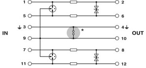 Schutzstecker PT mit Schutzschaltung für zwei 2-adrige erdpotenzialfrei betriebene Signalkreise. Nennspannung: 12 V DC. HART-fähig.