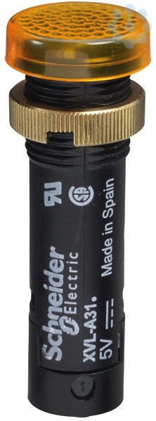 Gelbe Leuchtmelder mit einem Durchmesser von 12 mm. Die Schutzart ist IP40/IP65. Es ist mit LED-Abdeckung ausgestattet - 24 V, Kabelschuhanschluss. Es gehört zur Baureihe Harmony XVL mit einem Durchmesser von 8-12 mm, Kunststoff-Leuchtmelder.