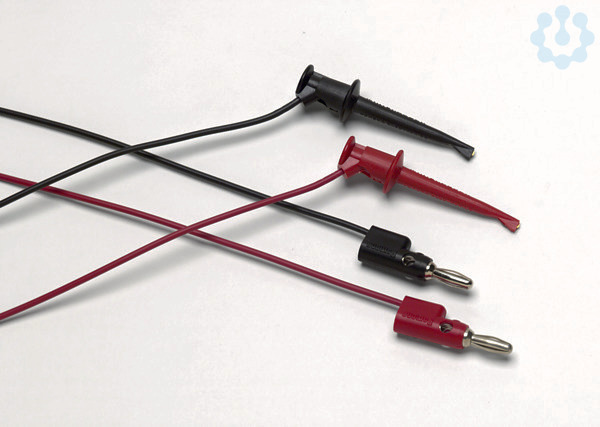 1 Paar Messleitungen (rot, schwarz) mit stapelbaren 4-mm-Bananensteckern und Mini-Hakenklemmen. Mini-Hakenklemmen können an Bauelementanschlüsse bis zu 1,5 mm Durchmesser angeschlossen werden, 90 cm lange PVC-isolierte Leitungen.