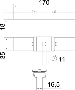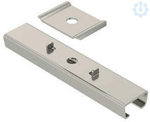 Mittenabhängung für Gitterrinnen, bestehend aus Klemmstück Typ GKS 50 und C-Profil-Schiene, zur Mittenabhängung von Gitterrinnen mit Gewindestangen, zur schraubenlosen Befestigung von Gitterrinnen mit der Maschenweite 50 x 100 mm.