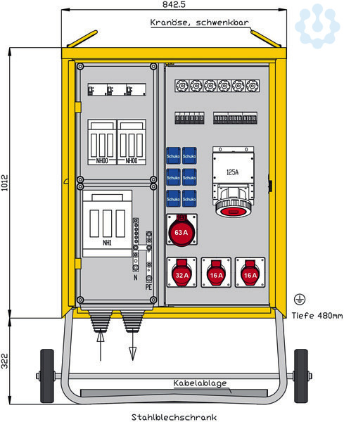 inkl. feuerverzinktem Untergestell Einbauten bis einschließlich RCD-Schutzschalter im Isolierstoffgehäuse Schutzart : IP 44 Größe ca.: 1012 x 843 x 480mm / H-B-T
