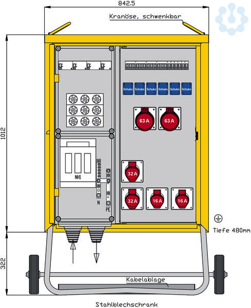 inkl. feuerverzinktem Untergestell Einbauten bis einschließlich RCD-Schutzschalter im Isolierstoffgehäuse Schutzart : IP 44 Größe ca.: 1012 x 843 x 480mm / H-B-T