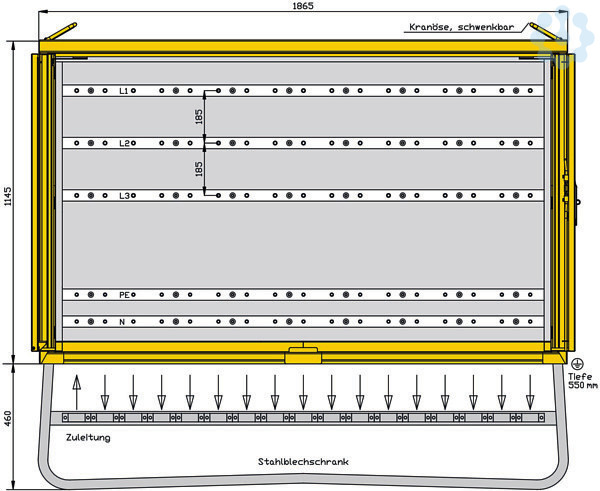 inkl. feuerverzinktem Untergestell mit Ösen für Erdnägel Einbauten bis einschließlich RCD-Schutzschalter schutzisoliert Schutzart : IP 44 Größe ca.: 1145 x 1865 x 550mm / H-B-T + Untergestell-Höhe ca.: 460mm 1 Cu-Sammelschienensystem 630A