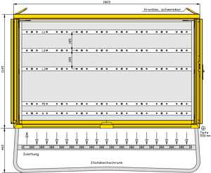 inkl. feuerverzinktem Untergestell mit Ösen für Erdnägel Einbauten bis einschließlich RCD-Schutzschalter schutzisoliert Schutzart : IP 44 Größe ca.: 1145 x 1865 x 550mm / H-B-T + Untergestell-Höhe ca.: 460mm 1 Cu-Sammelschienensystem 630A