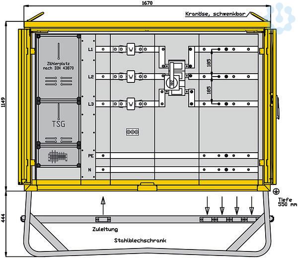 inkl. feuerverzinktem Untergestell mit Ösen für Erdnägel Einbauten bis einschließlich RCD-Schutzschalter schutzisoliert Schutzart : IP 44 Größe ca.: 1149 x 1670 x 550mm / H-B-T + Untergestell-Höhe ca.: 444mm 1 Cu-Sammelschienensystem 630A