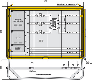 inkl. feuerverzinktem Untergestell mit Ösen für Erdnägel Einbauten bis einschließlich RCD-Schutzschalter schutzisoliert Schutzart : IP 44 Größe ca.: 1149 x 1670 x 550mm / H-B-T + Untergestell-Höhe ca.: 444mm 1 Cu-Sammelschienensystem 630A