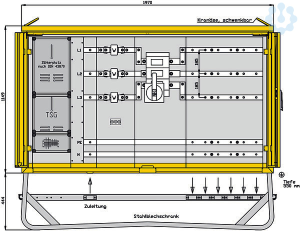 inkl. feuerverzinktem Untergestell mit Ösen für Erdnägel Einbauten bis einschließlich RCD-Schutzschalter schutzisoliert Schutzart : IP 44 Größe ca.: 1149 x 1970 x 550mm / H-B-T + Untergestell-Höhe ca.: 444mm 1 Cu-Sammelschienensystem 630A