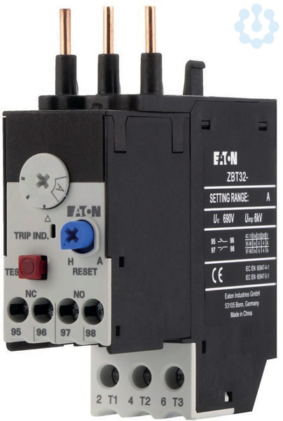 Motorschutzrelais, Sortiment: Bimetallrelais ZBT bis 97 A, Zusatzausrüstung, Zubehör: Motorschutzrelais, Baugröße: ZBT32, Phasenausfallempfindlichkeit: IEC/EN 60947, VDE 0660 Teil 102, Beschreibung: Test-/Aus-Taste, Reset-Taste Hand/Auto, Freiauslösung, Montageart: Direktanbau, Hilfsschalter S = Schließer: 1 S, Hilfsschalter Ö = Öffner: 1 Ö, verwendbar für: DILMT17, DILMT25, DILMT32, Normen und Bestimmungen: IEC/EN 60947, GB14048, Schutzart: IP20