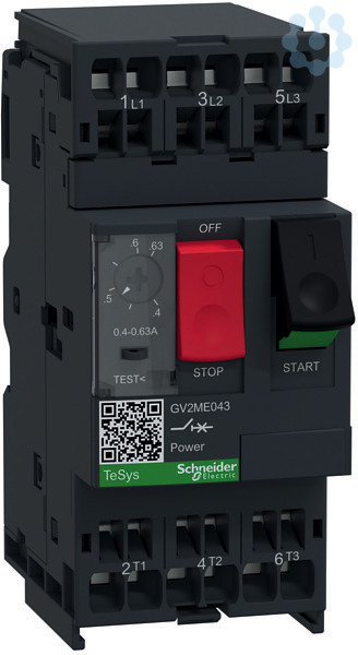 TeSys Motorschutzschalter GV2ME. Motorschutzschalter, 3P, Tasterbetätigung, Federzuganschluss. Bemessungsleistung 0,18 kW, Einstellbereich 0,40-0,63 A. Anschlussart Federzugklemmen.