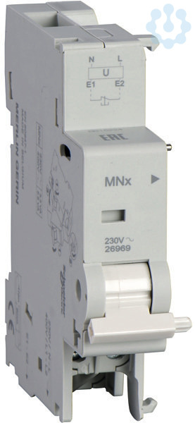 Unterspannungsauslöser MNx Multi 9 OEM. Betriebsspannung (Ue) 230V AC. Auslösung des zugehörigen Geräts durch Öffnung des Steuerstromkreises. Ein Abfall der Versorgungsspannung löst das zugehörige Gerät nicht aus. Eine sperrende Drucktastersteuerung ermöglicht es, dass der geschützte Stromkreis in einen Sicherheitszustand gesetzt wird. Mit mechanischer Statusanzeigeleuchte (rot) auf der Frontseite. Ausfallsichere Not-Aus-Funktion. Unempfindlich gegenüber Änderungen der Steuerkreisspannung für eine verbesserte Betriebskontinuität. Der Unterspannungsauslöser MNx erfüllt folgende Normen- IEC/EN 60947-1.