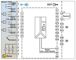 Multifunktionaler Ex-i Prozessanzeiger im Schalttafeleinbaugehäuse zur Überwachung und Darstellung von analogen Messwerten. Universaleingänge erlauben den Anschluss von Strom, Spannung, RTDs und TCs. Zwei Relaiswechslerausgänge und ein Analogausgang.