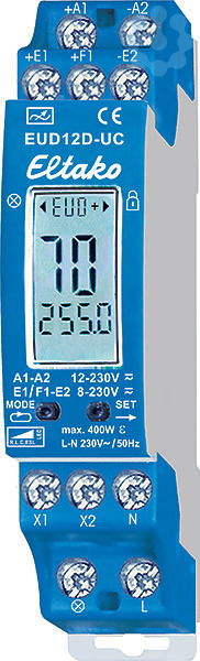 Universal-Dimmschalter mit automatischer Lampenerkennung. Stand-by-Verlust nur 0,3 Watt. Mindesthelligkeit, Maximalhelligkeit und Dimmgeschwindigkeit einstellbar. Mit Kinderzimmer- und Schlummerschaltung. 1 Teilungseinheit. Universal-Dimmschalter für Lampen bis 400W, abhängig von den Lüftungsverhältnissen. Dimmbare Energiesparlampen und dimmbare 230V-LED-Lampen zusätzlich abhängig von der Lampenelektronik. Bis zu 3600W mit Leistungszusätzen an den Anschlüssen X1 und X2. Die Steuereingänge sind von der Versorgungs- und Schaltspannung galvanisch getrennt. Schaltung im Nulldurchgang mit Soft-Ein und Soft-Aus zur Lampenschonung. Bei einem Stromausfall werden die Schaltstellung und die Helligkeitsstufe gespeichert und wird gegebenenfalls bei Wiederkehr der Versorgungsspannung eingeschaltet. Ab 110V Steuerspannung Glimmlampenstrom 5mA (nicht bei RTD). Automatische elektronische Überlastsicherung und Übertemperatur-Abschaltung. Die Funktionen und Zeiten werden gemäß Bedienungsanleitung mit den Tasten MODE und SET ei