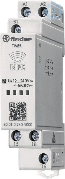 Multifunktions-Zeitrelais für DIN-Schiene, 17.5 mm breit, 1 Wechsler für 16 A / 250 V AC, Kontaktmaterial AgNi. Programmierbar über NFC, Funktionen: AI: Ansprechverzögerung, DI: Einschaltwischer, LI: Asymmetrischer Blinkgeber (impulsbeginnend), BE: Rückfallverzögerung über Startkontakt, CEb: Ansprech-/Rückfallverzögerung über Startkontakt, DE: Einschaltwischer über Startkontakt, Zeitbereich: 0.1 s - 24 h Versorgungsspannung: 12-240 V DC/AC (50/60 Hz), Relaisschutzart: IP 20