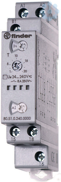 Multifunktions-Zeitrelais für DIN-Schiene, 17.5 mm breit, 1 Wechsler für 8 A / 250 V AC, Kontaktmaterial AgNi. Funktionen: AI: Ansprechverzögerung, DI: Einschaltwischer, SW: Impulsrelais (Blinker) impulsbeginnend, BE: Rückfallverzögerung, CE: Ansprech-/Rückfallverzögerung, DE: Impulsformer (Einschaltwischer), Zeitbereich: 0,1 s - 24 h, Versorgungsspannung: 24-240 V DC/AC (50/60 Hz), Relaisschutzart: IP 20
