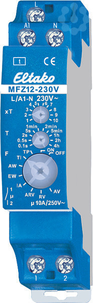 Analog einstellbares Multifunktions-Zeitrelais mit 10 Funktionen. Stand-by-Verlust nur 0.4 Watt. Zeiten zwischen 0.1 Sekunden und 40 Stunden sind einstellbar. Funktionen F: RV = Rückfallverzögerung. AV = Ansprechverzögerung. TI = Taktgeber mit Impuls beginnend. TP = Taktgeber mit Pause beginnend. IA = Impulsgesteuerte Ansprechverzögerung (z.B. automatischer Türöffner). EW = Einschaltwischer. AW = Ausschaltwischer. ARV = Ansprech- und Rückfallverzögerung. ON = Dauer EIN. OFF = Dauer AUS. Die Leuchtdiode unter dem großen Drehschalter informiert während des Zeitablaufes über die Kontaktstellung. Sie blinkt solange der Arbeitskontakt offen ist und leuchtet ständig, solange der Arbeitskontakt geschlossen ist. Die Zeitbasis T wird mit dem mittleren rastenden Drehschalter T eingestellt.