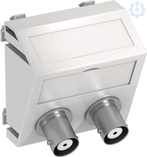 Multimediaträger mit zwei BNC Anschlussbuchsen, Kabelauslass schräg, mit Beschriftungsfeld, zwei BNC Kupplungen in Ausführung Buchse-Buchse. Trägerplatte mit Rastbefestigung, geeignet für den waagerechten und senkrechten Einbau in die Systemumgebung.