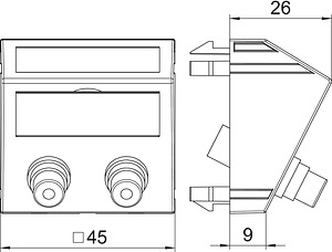 Multimediaträger mit zwei Cinch Anschlussbuchsen für Audio R / L, Kabelauslass schräg, mit Beschriftungsfeld, zwei Cinch Buchsen (RCA) mit Lötanschluss, Farbkodierung rot / weiß. Trägerplatte mit Rastbefestigung, geeignet für den waagerechten und senkrechten Einbau in die Systemumgebung.