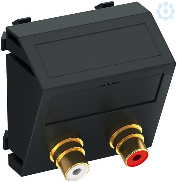 Multimediaträger mit zwei Cinch Anschlussbuchsen für Audio R / L, Kabelauslass schräg, mit Beschriftungsfeld, zwei Cinch Kupplungen (RCA) in Ausführung Buchse-Buchse, Farbkodierung rot / weiß. Trägerplatte mit Rastbefestigung, geeignet für den waagerechten und senkrechten Einbau in die Systemumgebung.