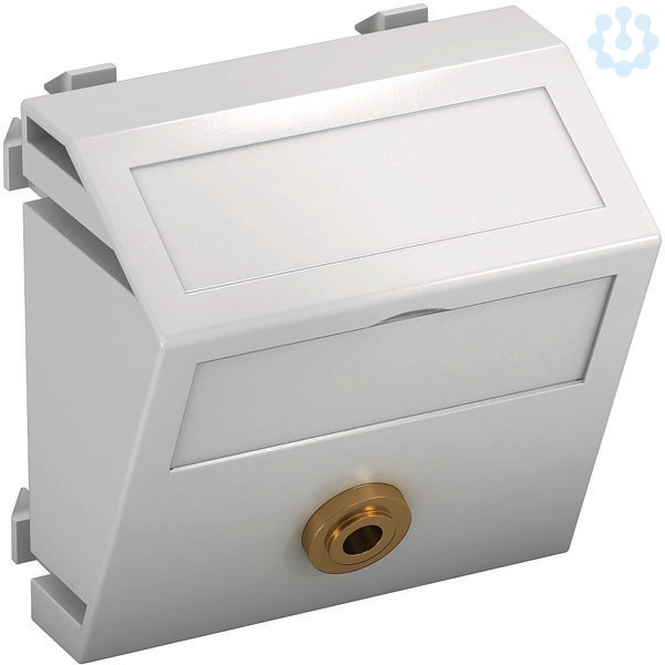 Multimediaträger mit einer Mini-Klinken Anschlussbuchse, Kabelauslass schräg, mit Beschriftungsfeld, Mini-Klinken Buchse (TRS 3,5 mm) mit Lötanschluss. Trägerplatte mit Rastbefestigung, geeignet für den waagerechten und senkrechten Einbau in die Systemumgebung.