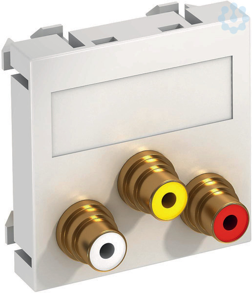 Multimediaträger mit drei Cinch Anschlussbuchsen für Audio-Video, Kabelauslass gerade, mit Beschriftungsfeld, drei Cinch Kupplungen (RCA) in Ausführung Buchse-Buchse, Farbkodierung gelb/rot/weiß. Trägerplatte mit Rastbefestigung, geeignet für den waagerechten und senkrechten Einbau in die Systemumgebung.