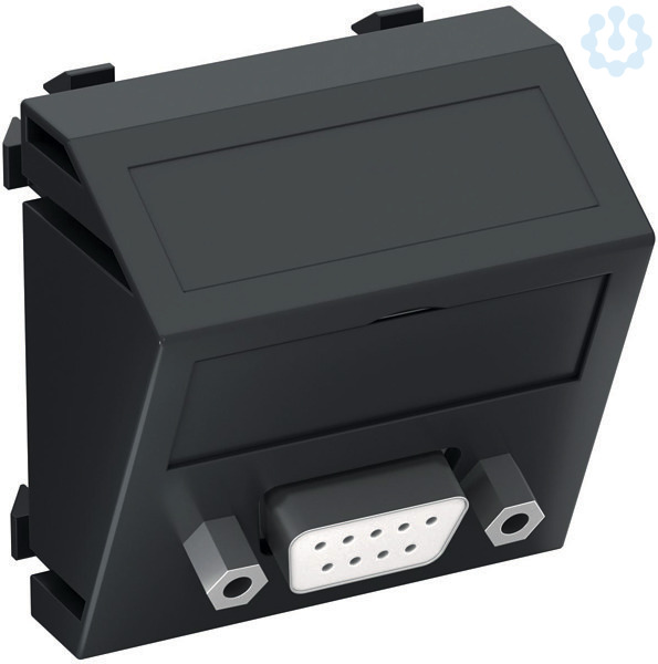 Multimediaträger mit einer D-Sub9 Anschlussbuchse, Kabelauslass schräg, mit Beschriftungsfeld, D-Sub9 Buchse (RS232) mit Schraubanschluss. Trägerplatte mit Rastbefestigung, geeignet für den waagerechten und senkrechten Einbau in die Systemumgebung.