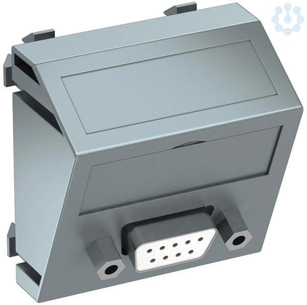 Multimediaträger mit einer D-Sub9 Anschlussbuchse, Kabelauslass schräg, mit Beschriftungsfeld, D-Sub9 Buchse (RS232) mit Schraubanschluss. Trägerplatte mit Rastbefestigung, geeignet für den waagerechten und senkrechten Einbau in die Systemumgebung.